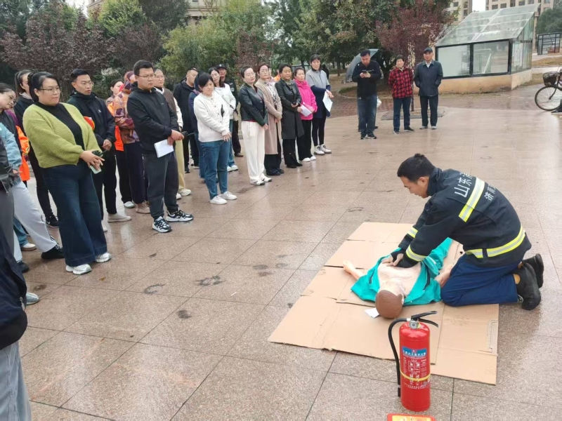 疏散演练结束后,消防人员系统讲解了消防器材的使用方法和应急救援要点,现场演示了干粉灭火器“提、拔、握、压”四步操作流程,并指导居民进行实操练习,纠正不规范动作,确保灭火剂精准喷射、高效灭火。现场还开展了医疗急救培训,借助假人模型讲授急救常识与心肺复苏等技能。