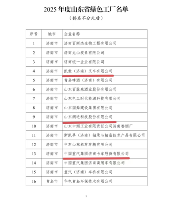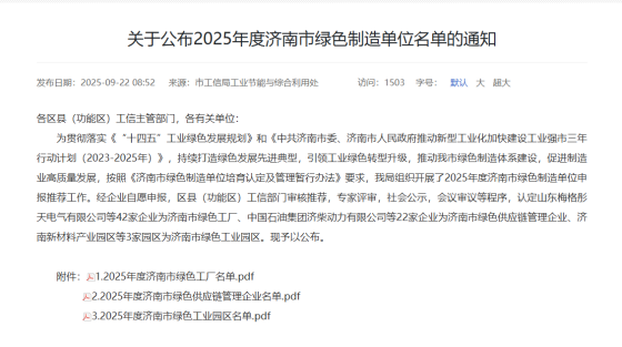近日,山东省工业和信息化厅、济南市工业和信息化局相继公布2025年度山东省绿色制造单位名单、2025年济南市绿色制造单位名单的通知,莱芜区凯傲(济南)叉车有限公司、山东朗进科技股份有限公司、中国重汽集团济南卡车股份有限公司3家企业入选2025年山东省绿色工厂名单,宏济堂制药(莱芜区)有限公司等5家企业入选济南市绿色工厂,4家企业入选济南市绿色供应链管理企业,1家园区入选济南市绿色工业园区,截至目前,莱芜区已创建国家级绿色工厂1家,国家级绿色设计产品2个,国家级绿色设计示范企业1家,国家级绿色工业园区1家,省级绿色工厂7家,省级绿色工业园区1家,市级绿色工厂46家,市级绿色工业园区(集群、集聚区)6家,市级绿色供应链管理企业7家,市级节水示范(典范)企业8家,市级绿色设计产品1个,绿色制造体系达到82家,全区绿色化水平持续提升。