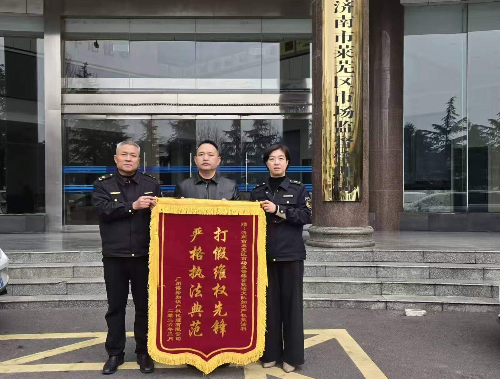 “感谢市场监管部门的高效执法和公正处理,保护了我们品牌的合法权益,也维护了公平竞争的市场环境!”近日,广州博裕知识产权代理有限公司相关负责人专程来到区市场监管局,将一面印有“严格执法典范 打假维权先锋”字样的锦旗,郑重地送到了执法人员手中,对执法人员在商标侵权案件中的果断处置和专业执法表示感谢。此前,区市场监管局在短时间内成功查处了辖区内多家单位未经授权使用某商标的侵权行为,展现出市场监管的“速度”与“力度”。
