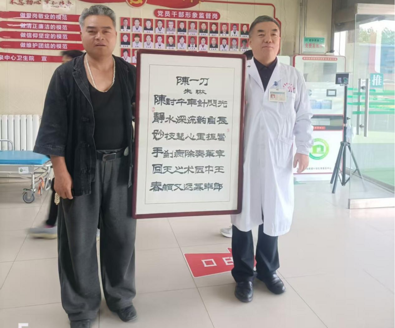 4月13日上午,牛泉中心卫生院内暖意融融,洋溢着温馨和谐的气氛,患者朱琳手持亲手书写、装裱精良的书法作品,来到医院专程向外科陈静医生表达诚挚感谢。作品中的亲笔藏头诗饱含真情,既是对医生妙手回春的由衷赞叹,也是基层医患情深的生动注脚。