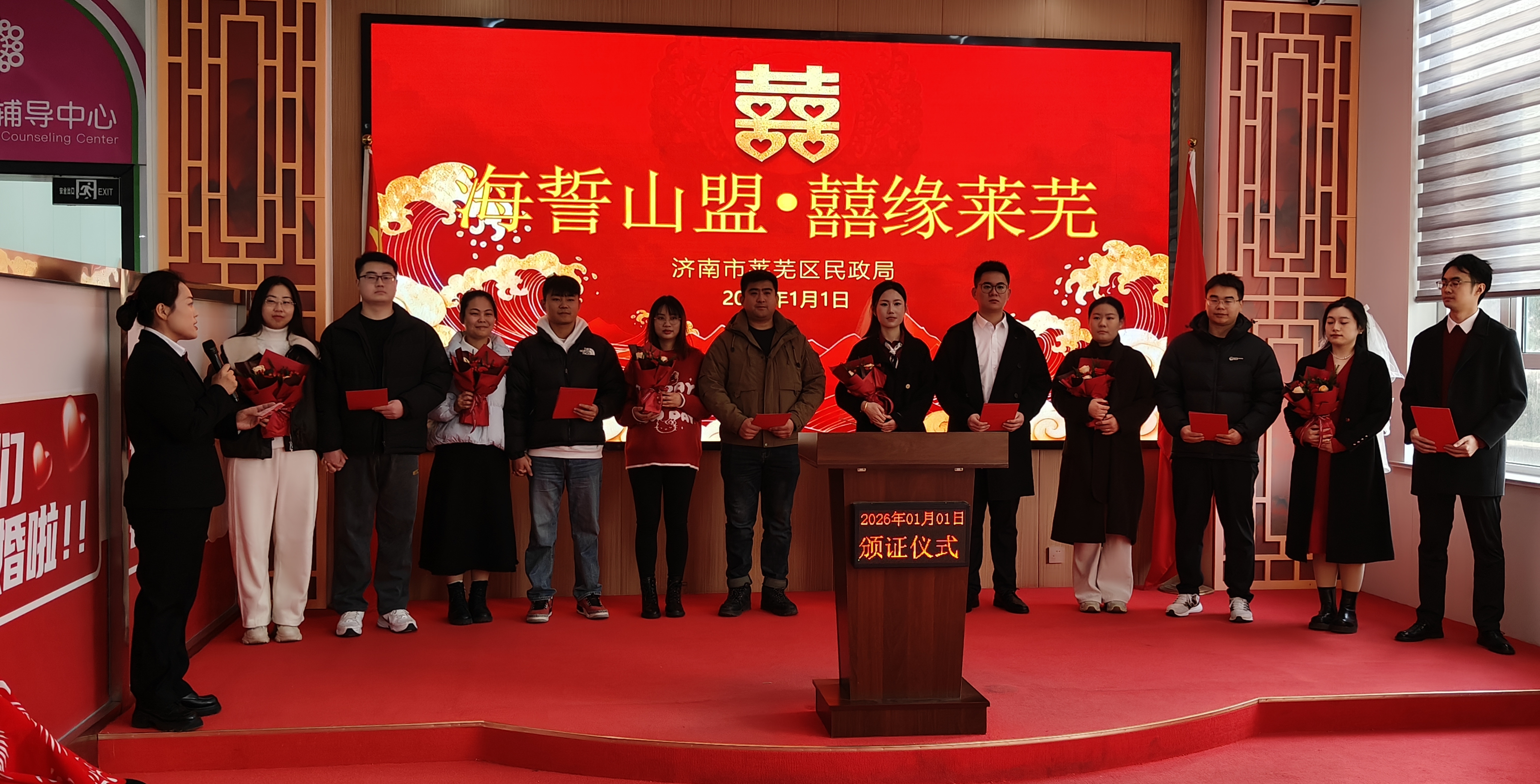 辞旧迎新启新程,喜结连理贺元旦。2026年元旦,莱芜区婚姻登记处秉持“以群众需求为导向”,精心打造集体颁证仪式、非遗剪纸体验等特色活动。
