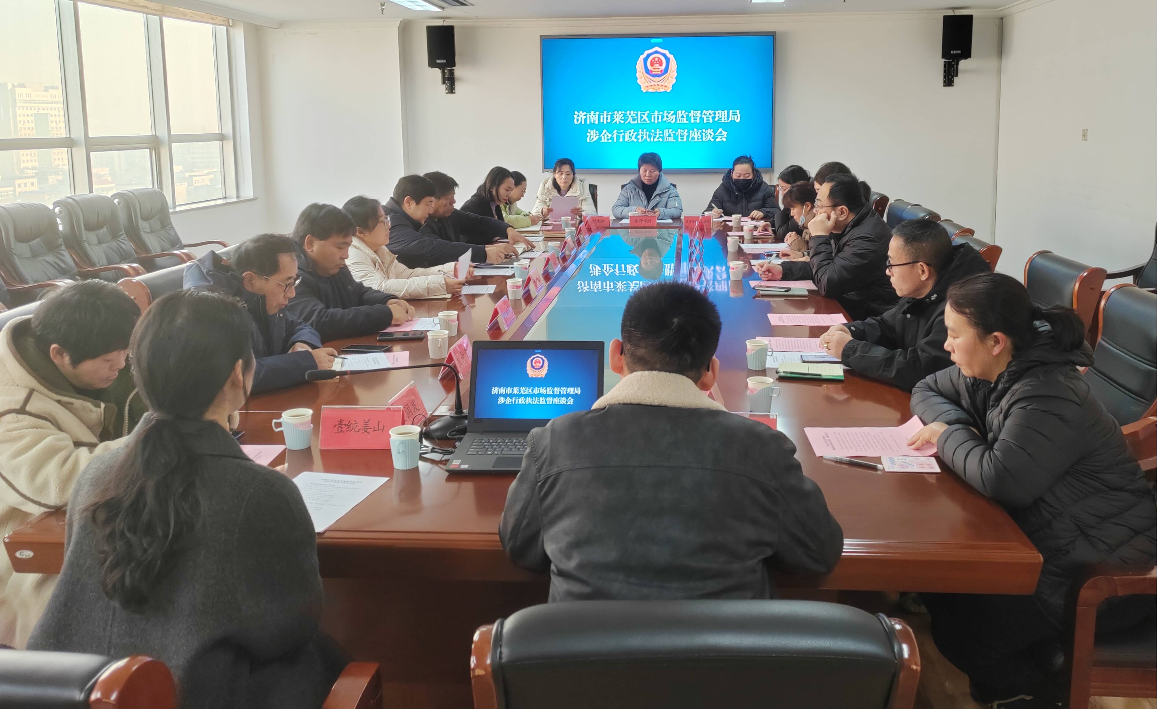 为深入规范行政执法行为,畅通政企沟通渠道,持续优化法治化营商环境,1月15日,莱芜区市场监督管理局组织召开涉企行政执法监督专题座谈会,邀请区司法局执法监督科负责同志及18家食品、药品等重点领域企业代表齐聚一堂,以“面对面倾听、实打实交流”的方式凝聚监管共识,共商发展良策。