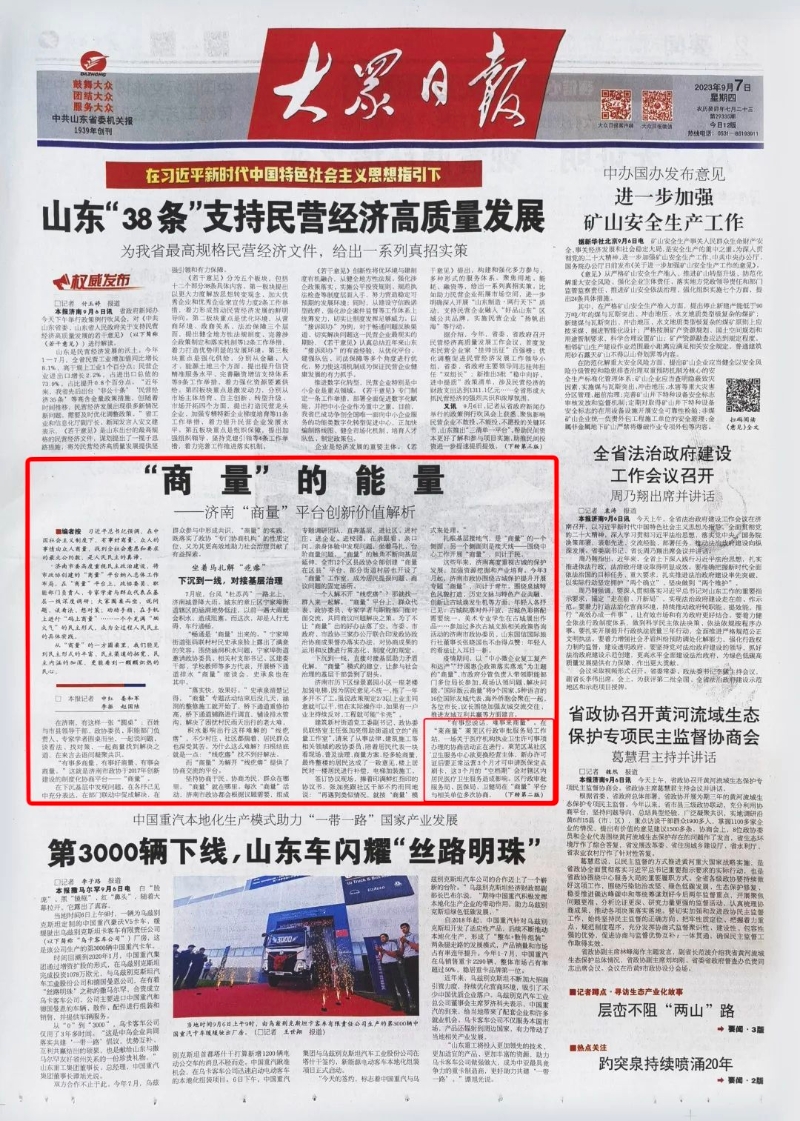 9月7日,《大众日报》头版刊发文章《“商量”的能量——济南“商量”平台创新价值解析》。其中报道区行政审批服务局“莱商量”工作站协商活动。全文如下: