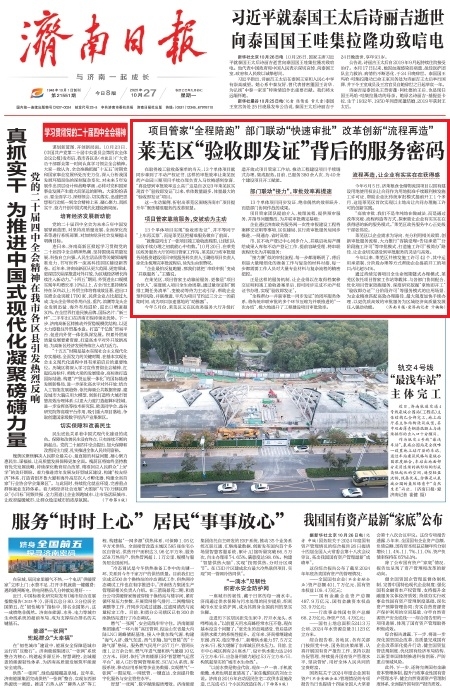 10月27日,《济南日报》头版以《莱芜区“验收即发证”背后的服务密码》为题聚焦莱芜区,现将全文转发如下:
