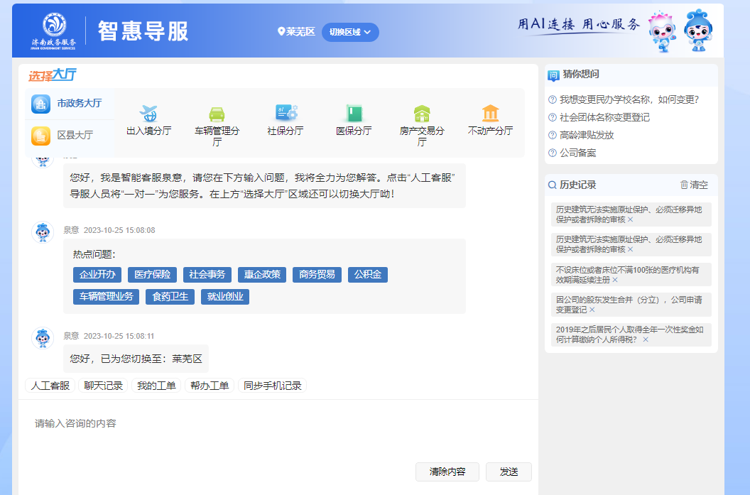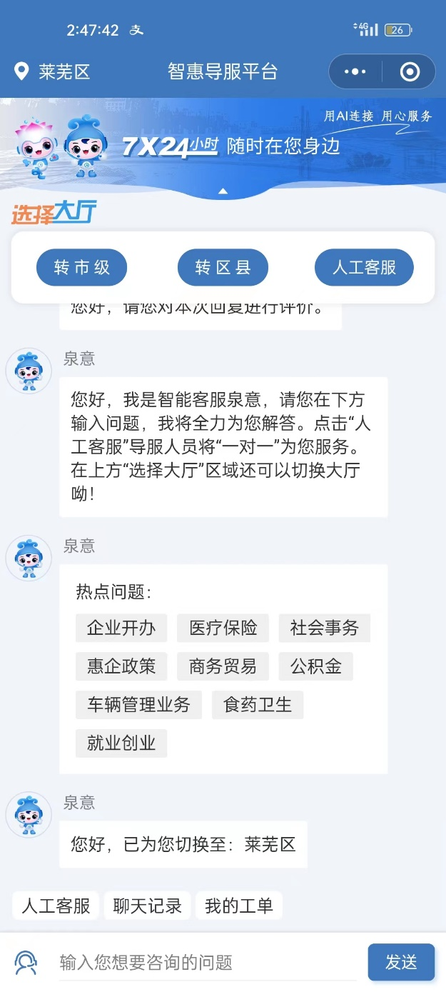 3.“智惠导服”平台。关注“济南市莱芜区行政审批服务局”微信公众号,点击“莱e办”-“智惠导服”即可跳转至页面,也可登录“智惠导服”网页版。(https://jnzwfw.jinan.gov.cn/quanwen/quanwenclient/#/pages/index/chat_pc)。