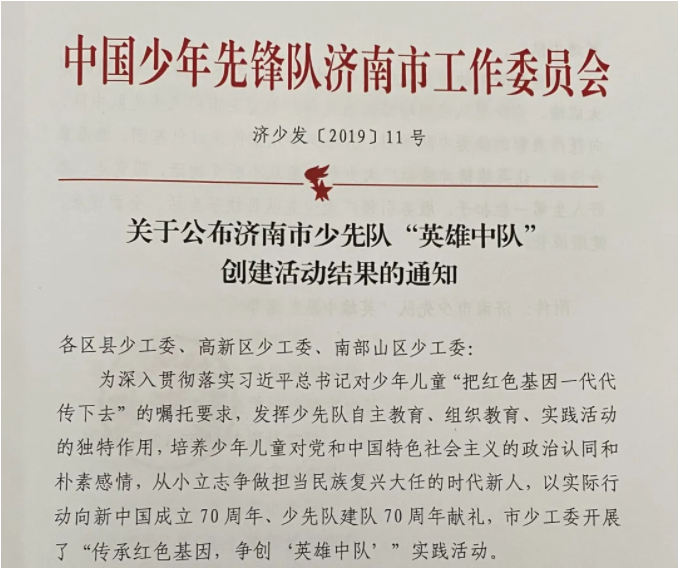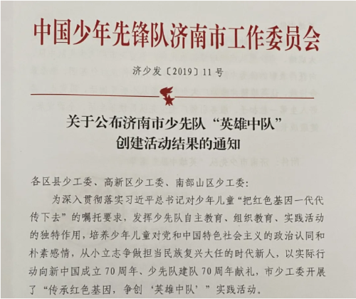 在济南市少工委近日下发的通知中,莱芜区共有五个中队荣获济南市少先队“英雄中队”称号,胜利小学雷锋中队名列其中。