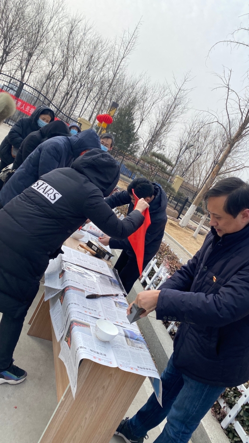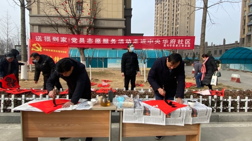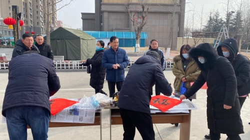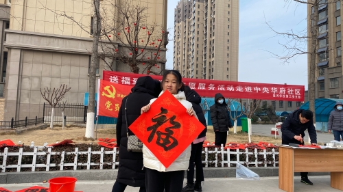 活动现场书志愿者们挥毫泼墨,一刻不得闲,力求将最好的字写给大家,行、隶、草等多种书体各显神韵。老师们一边晾干春联,一边派送“福”字。一幅幅吉祥喜庆,寓意美满的春联在志愿者笔下诞生,一副副寓意吉祥的祝福跃然在纸上,渲染出春节的喜庆气氛。慕名前来的群众一边欣赏志愿者的创作,一边品评着春联的寓意,现场一派欢乐景象。居民段大爷拿着“福”字,赞叹不已。他说:“家里正好缺少‘福’字,本来是打算出去买的,现在好了,社区共建单位将这么好的字亲自送上门,同时也将福气送到了我们家。”