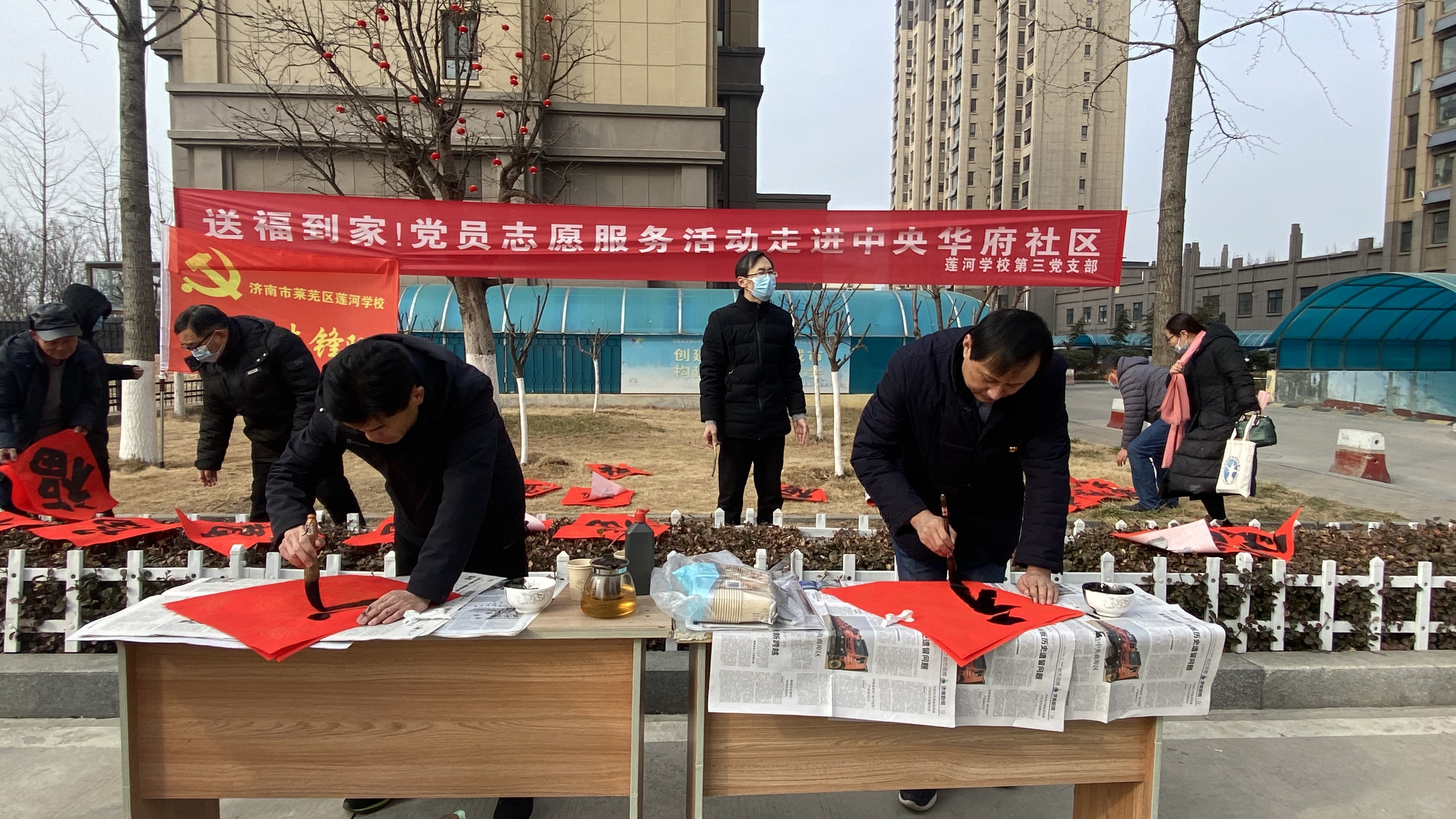 “看,这些福字贴在家里肯定喜气”。1月26日上午,天气虽然寒冷,但中央华府社区却有着红红火火的过年气息。莱芜区莲河学校部分教师志愿者买好笔墨纸张,走进中央华府社区书写“福”字和“对联”,打算在新年来临之际,赠送给社区居民,给他们送上新年的祝福。
