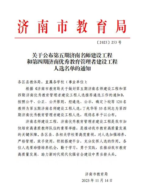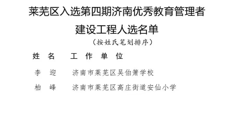 近日,济南市教育局对第五期济南名师建设工程人选、第四期济南优秀教育管理者建设工程人选市级遴选结果进行公布。莱芜区9名教师入选第五期济南名师建设工程人选,2名校长入选第四期济南优秀教育管理者建设工程人选。