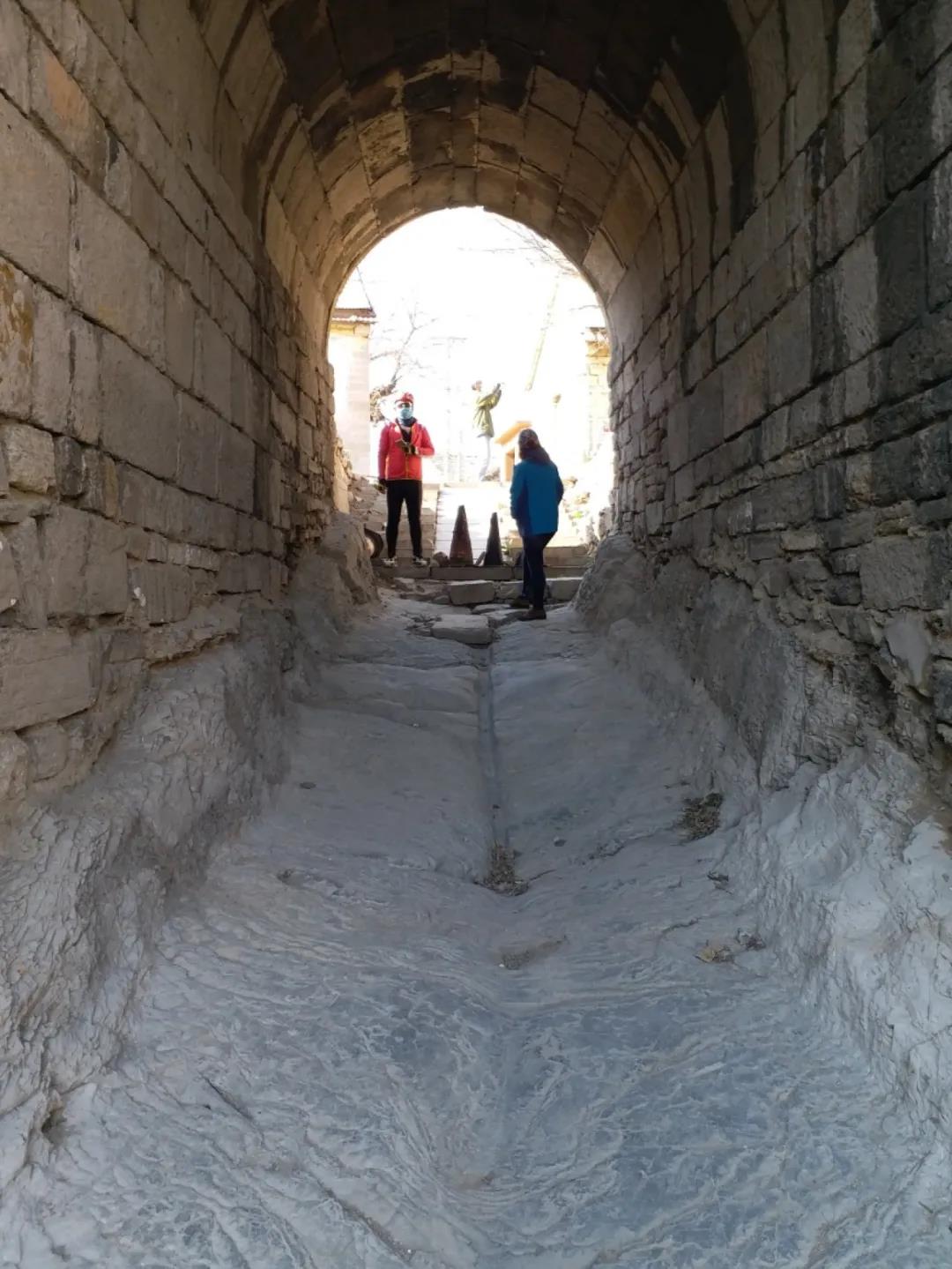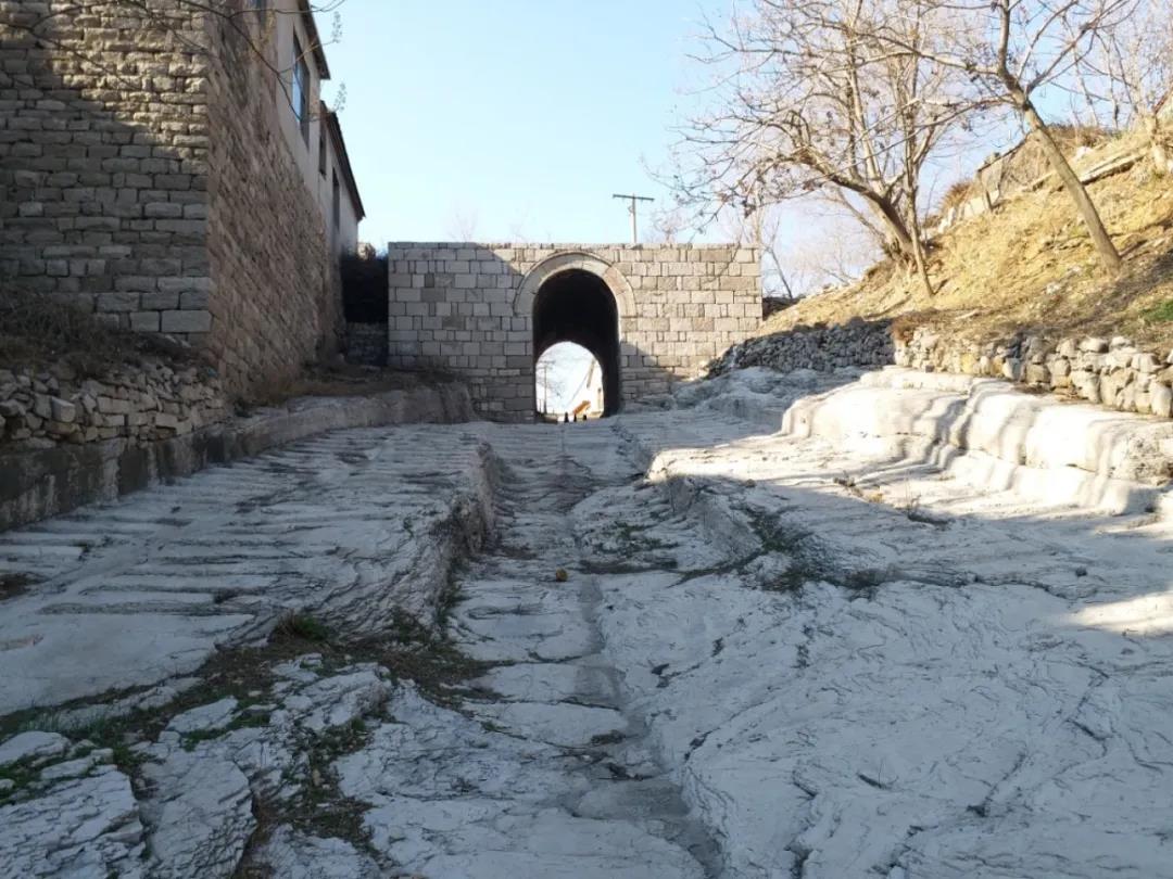 门外下斜石板路长百米,宽10米,中间被独轮车辗压出一道10厘米深、8厘米宽的石沟槽,两旁凿着石阶,是人行道。路边紧靠山麓,路窄难行,古时车马常堵塞。在铺满青石的街道上硬生生的压出了一条"褶子"。推车攀爬这段百米的石板路,非有数人前拉后推不可,其艰难可想而知。