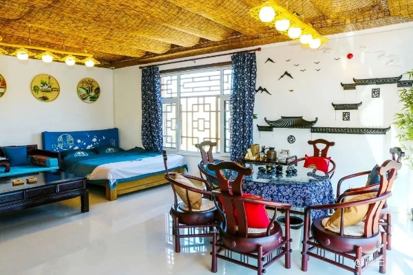 推开门,整洁干净的屋内陈设令人瞬间轻松。桌椅、茶几等均采用木制家具,透露着些许古典气息。摆放着的古朴雅致茶具,与三两好友一起住进院落,沏上一壶茶,或谈天说地,或让思绪短暂游离,去山间世界邂逅奇遇,都是乐事一件。
