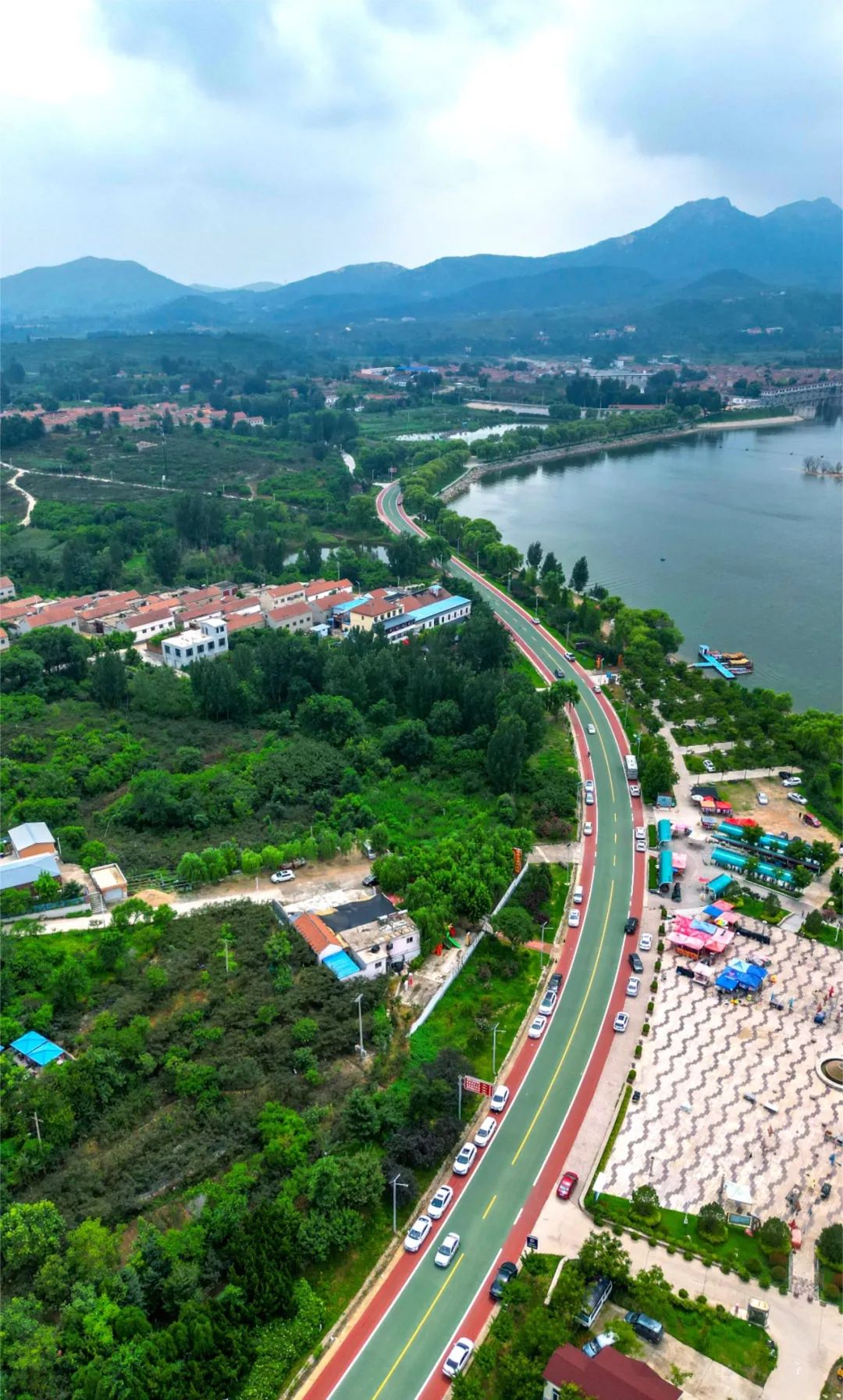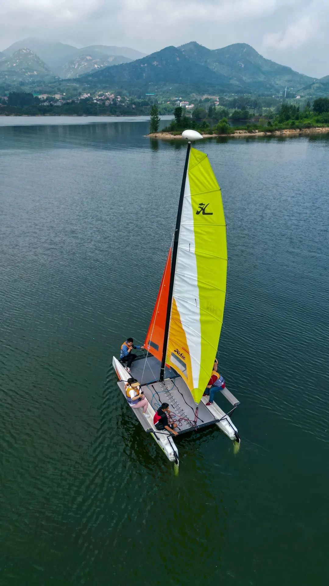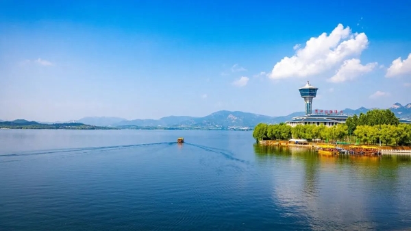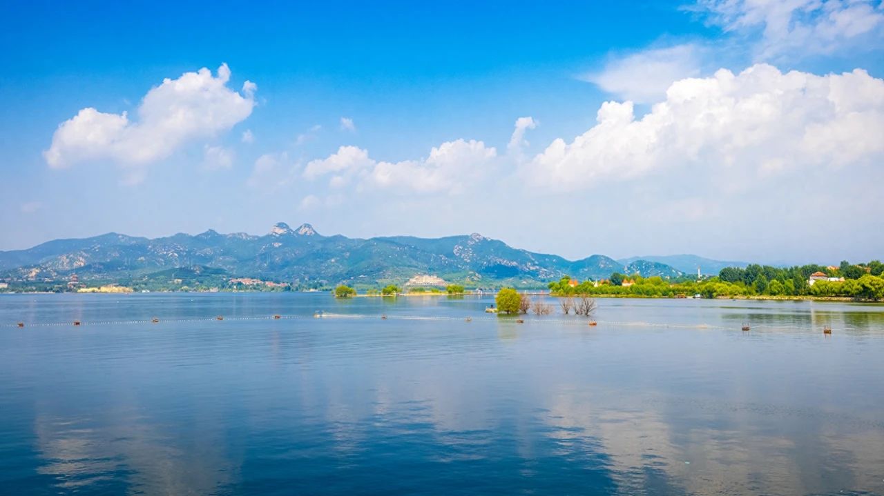 瓦蓝的天空,连绵的山川,秋高气爽的湖边