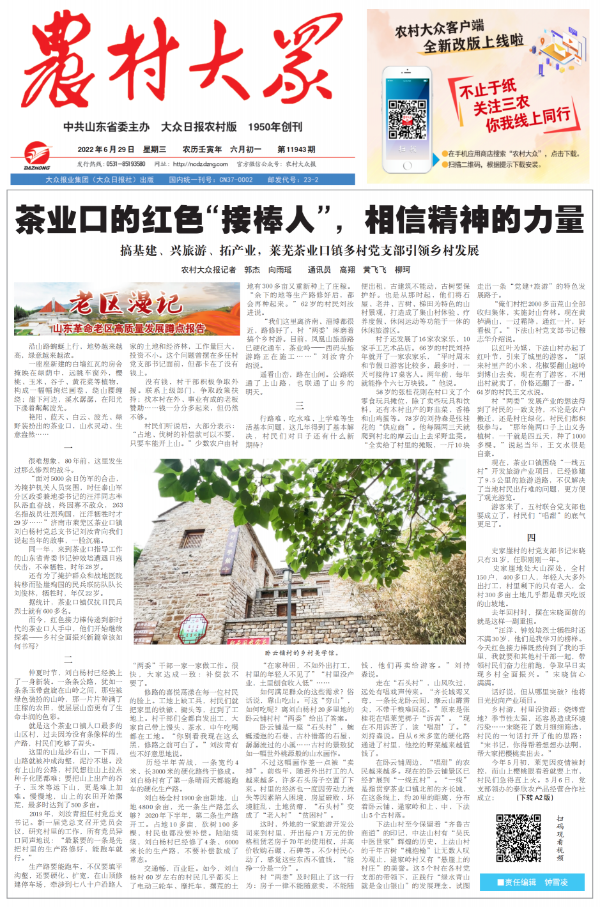 6月29日,《农村大众》报道莱芜区,点赞莱芜区茶业口镇红色文化发展与乡村全面振兴新篇章,近年来,茶业口镇搞基建、兴旅游、拓产业、多村党支部引领乡村发展,有了日新月异地变化。现原文转载,以飨读者。