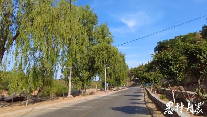 一座座新建的白墙红瓦的房舍掩映在绿荫中,远眺车窗外,樱桃、玉米、谷子、黄花菜等植物,构成一幅幅绚烂画卷,绕山腰缠绕;崖下河边,溪水潺潺,在阳光下漾着粼粼波光。