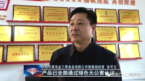 济南市莱芜金三黑食品有限公司销售部经理 张可文:现在年加工各类冷鲜食品200多吨,调理食品100多吨,熟食制品100多吨,我们这个公司是莱芜唯一一家以莱芜地方特色畜禽为加工原料的绿色食品生产基地,食品已全部通过绿色无公害认证,和农业农村部农产品地理标志登记证书。