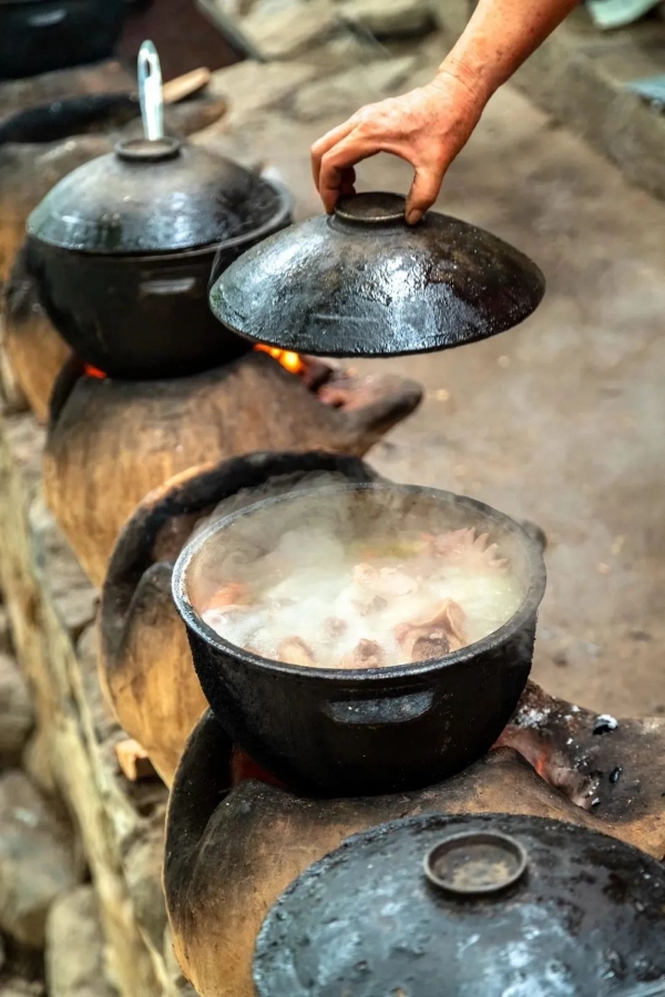 土炉炖鸡选取当地新鲜食材,散养山鸡配以时令蔬菜,香菇等,放入用泥土捏成的特殊陶炉中,以木柴文火慢炖而成。