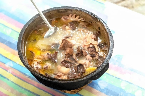 经过一个小时熬制出来的鸡汤色泽金黄,汤汁醇郁,鸡肉鲜香,是来这里的游客必点的一道美食。