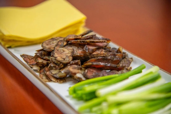 莱芜香肠又称南肠,它用料讲究,色泽黑亮,香味浓郁,是传承百年的莱芜老味道。肥瘦相间的香肠,用秘制的调味料腌煮,一阵风吹过,老远就能闻到肉和香料混合在一起的香味。吃在嘴里,咸香味浓,非常下饭。