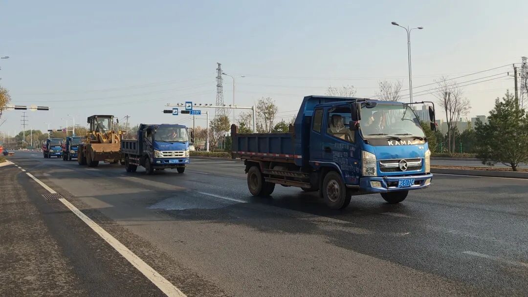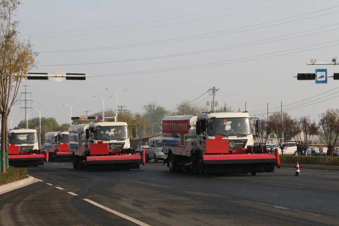 在山财大街西首,清雪除冰演练拉开帷幕。“演练正式启动!”。六大“方阵”依次通过,展现“机械为主、人工为辅、协同作战”的清雪除冰全流程:融雪剂撒布方阵如“开路先锋”,6台撒布机呈斜线队列,精准撒布融雪剂,为后续作业打通通道。紧随其后的是滚刷除雪方阵,9台滚刷车分组推进,每小时作业面积可达数千平方米,高效清除路面浮雪。3台除冰铲专攻压实冰雪,展现“破冰攻坚”硬实力。冰雪清运方阵由装载机与自卸车组成“V字形”,实现“铲—装—运”一体化作业。精细化作业方阵由10台手推式除雪机组成,它们灵活穿梭,主要对人行道、公交站台等机械盲区进行精细清理。最后,20名保洁员手持推雪板、除冰铲组成人工保障方阵,完成“最后一公里”的冰雪清理,确保路见本色、通行无阻。