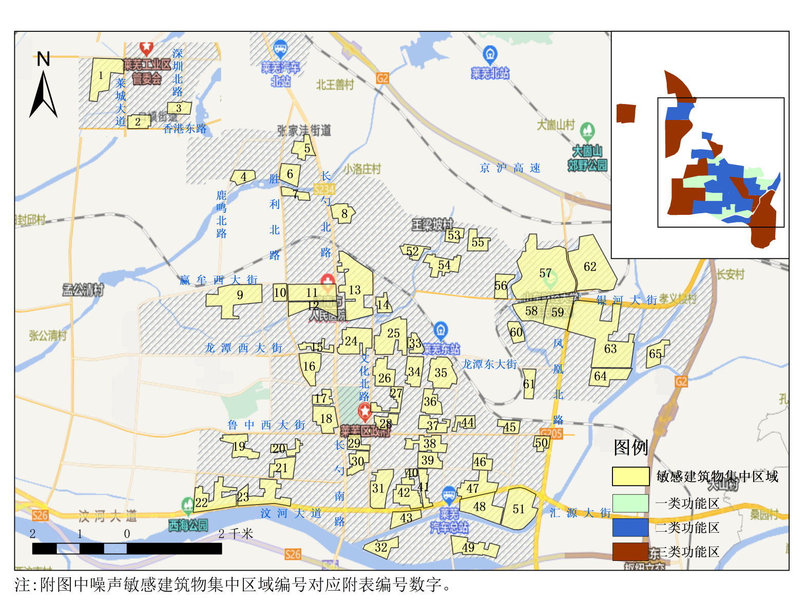 本次共划定敏感建筑物集中区域65块,面积16.45平方公里,占莱芜区1类和2类声功能区面积的26.78%,占莱芜区总面积的0.94%。详见附图和附表。